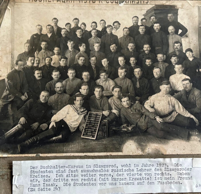 Dieses Foto von den Buchhalterkurs Teilnehmern in Slawgorod stammt aus dem Jahr 1923. Das Foto hat uns Gerda Vogt aus Kanada zugeschickt. Ihr Großvater Abram Löwen GM #641428 sitzt in der ersten Sitzreihe, vierter von rechts. Rechts von Abram Löwen sitz sein Freund Johann Isaak (dritter von rechts, mit der kurzer Krawatte).