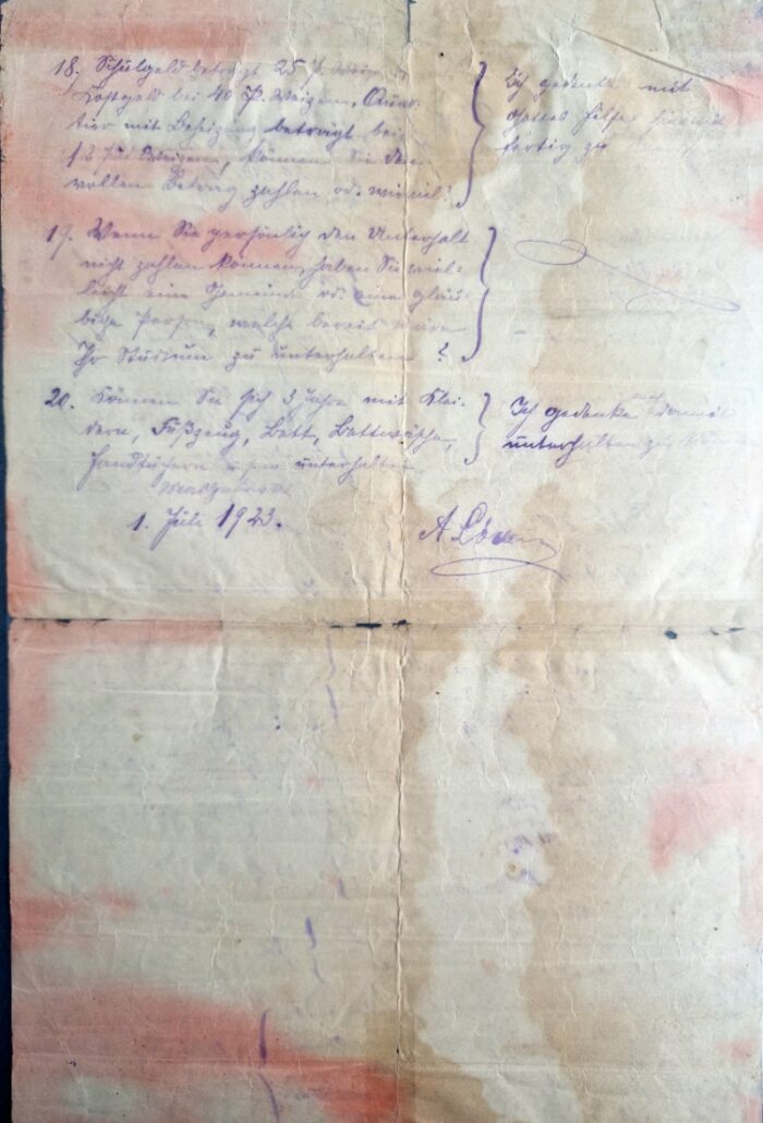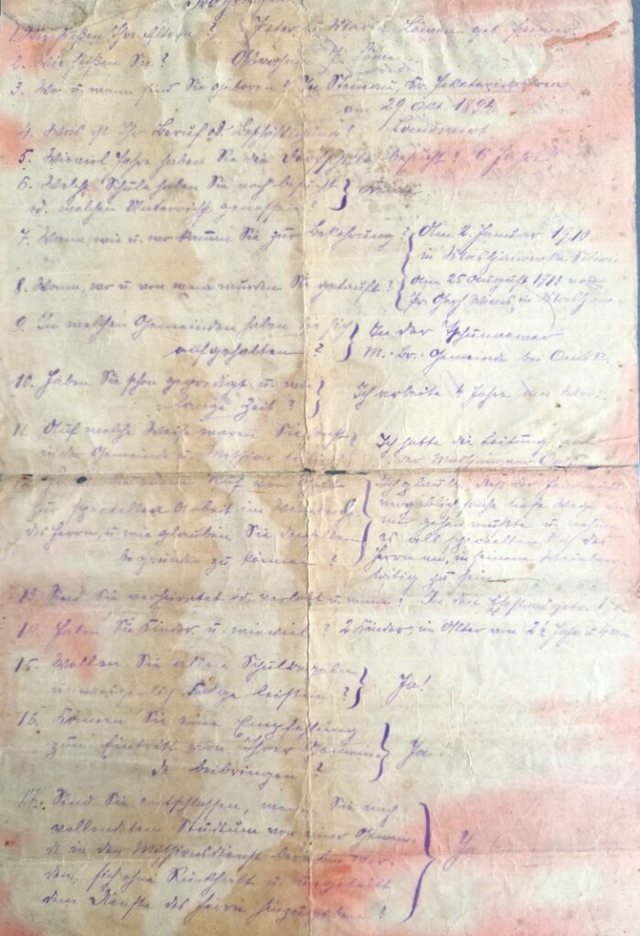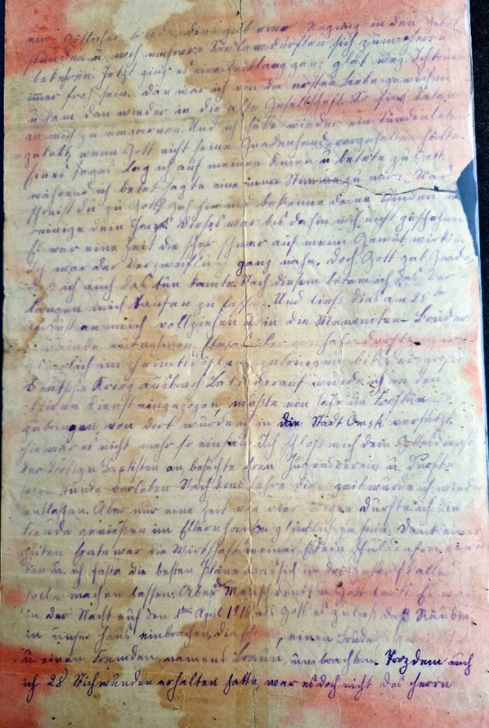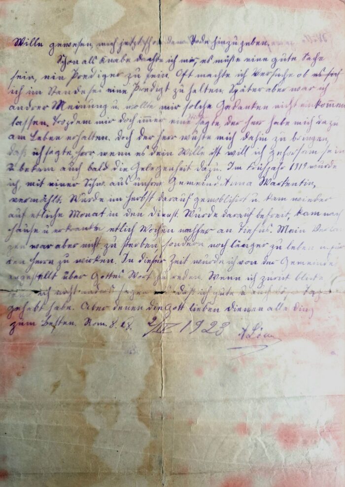 Diese Kopien von Dokumenten der Familie Peter Löwen wurden uns von Eugenia Löwen zugeschickt. Die Originaldokumenten von dem Lebenslauf mit Bekehrung, eine handschriftliche Lebensgeschichte in Sütterlin und ein Fragebogen, ausgefüllt am 1 Juli 1923, von Abram Löwen, als er sich zur Ausbildung in Bibelschule beworben hat, befinden sich im Besitz ihrer Familie.